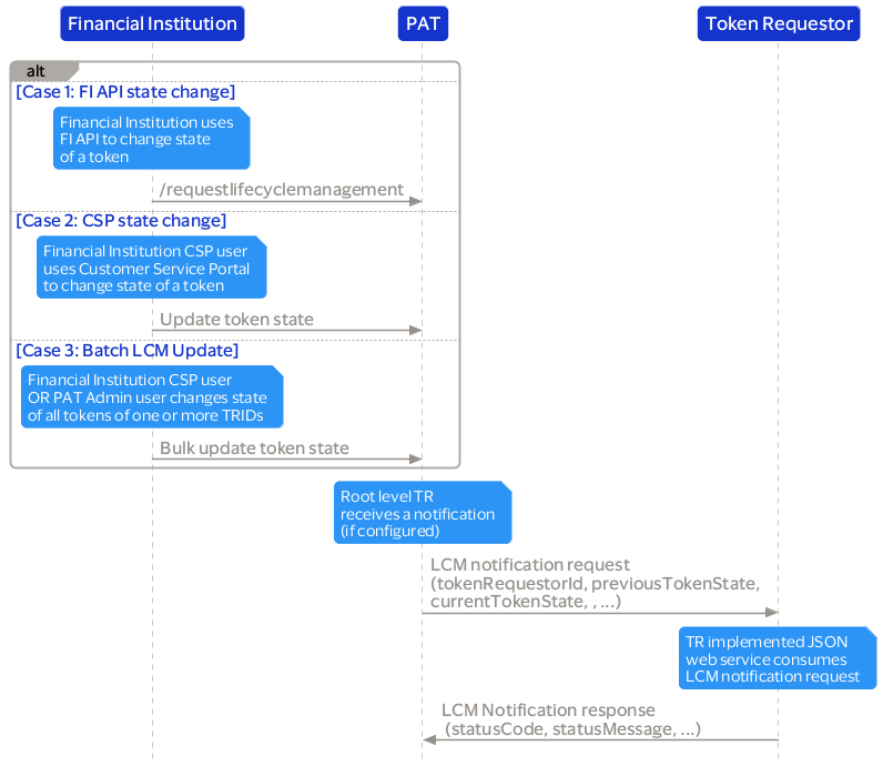 Financial institutions can change the state of tokens that are linked to their real account numbers. Token state changes can be initiated using the Financial Institution API, Customer Service Portal or batch lifecycle management. The token requestor that owns the linked token can receive a notification. If the token requestor is part of a requestor chain, then the notification is sent to the root level token requestor.