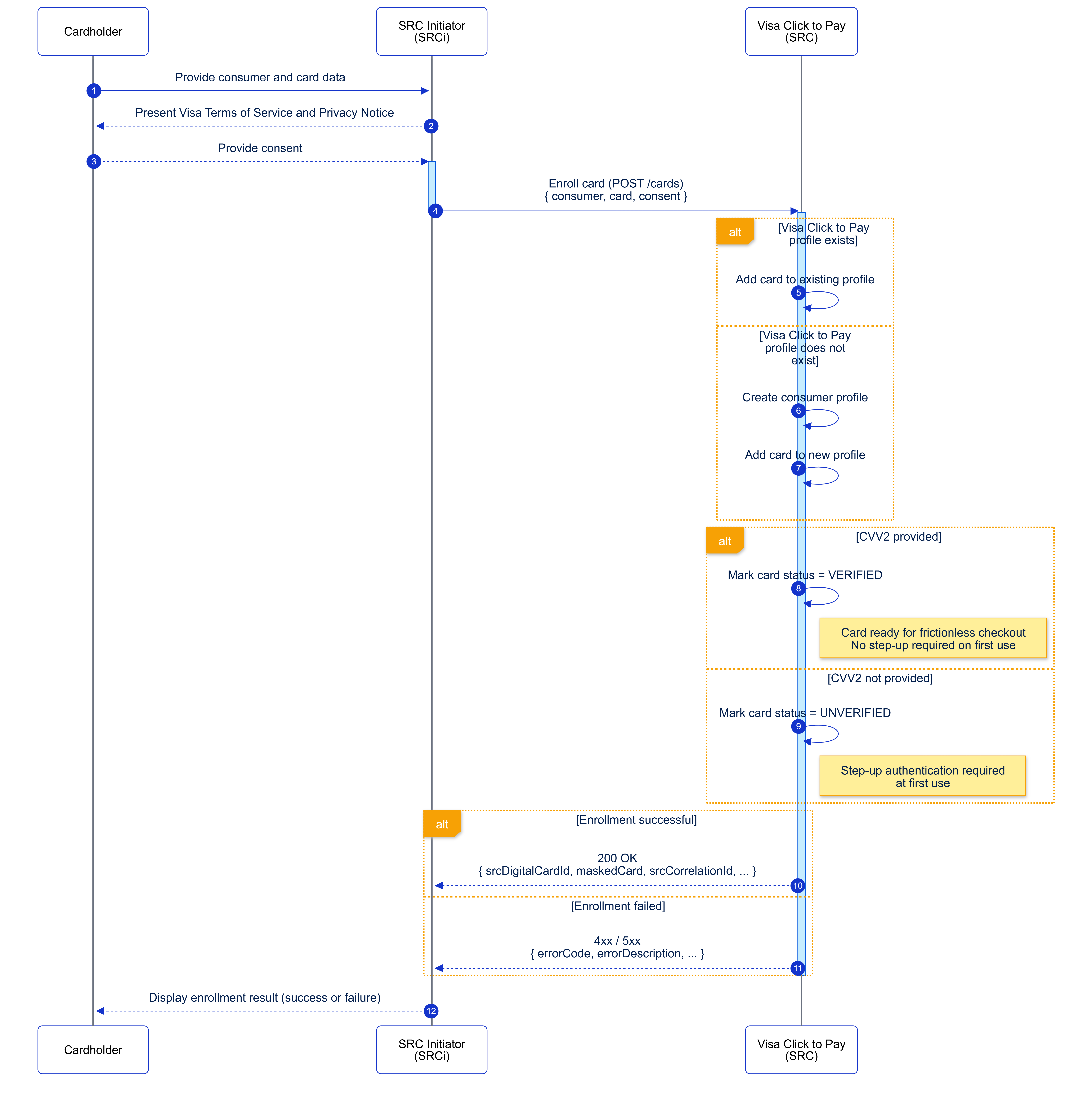 The Card Enrollment capability allows an SRC Initiator (SRCi) to submit a consumer payment credential to Visa Click to Pay for enrollment. Using POST /cards, the SRCi provides the required consumer and card data, and Visa Click to Pay determines whether a consumer profile already exists. Visa Click to Pay then creates or updates the consumer profile, associates the payment credential, and returns the enrollment result.