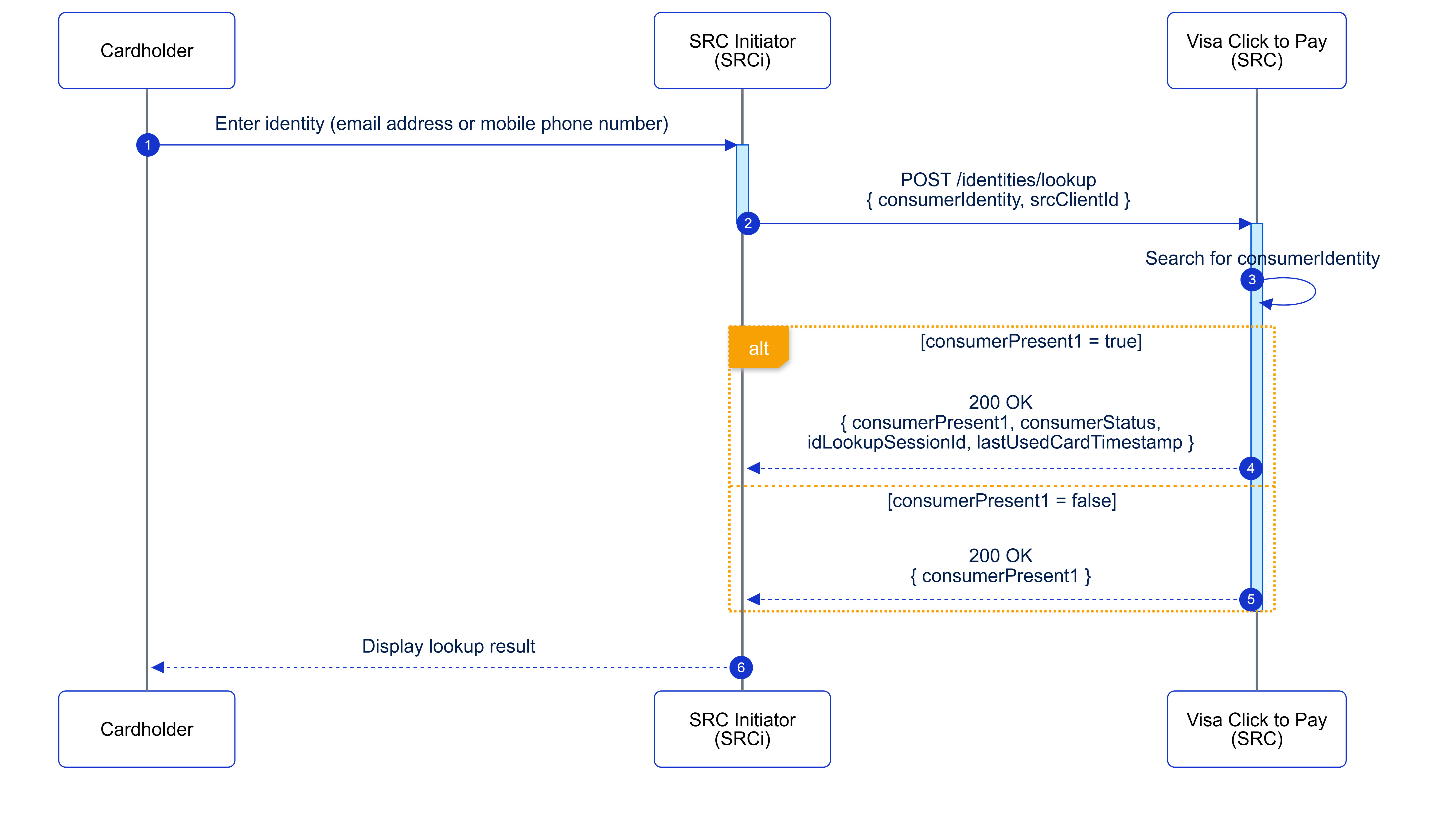 Identity Lookup enables SRCis to determine whether the provided consumer identity (email address or mobile phone number) exists within Visa Click to Pay. SRCis (Non-Payment SRCi or Payment SRCi) or an SRCi Enabler may use Identity Lookup.