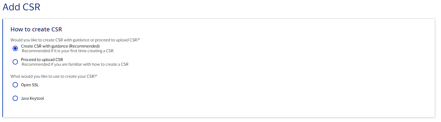 In Certification and Production environments, there are two methods for Adding a Certificate Signing Request to a project. By selecting “Create CSR with guidance (Recommended),” Visa Developer will guide you through the CSR generation process in steps. This option is recommended if it is your first time creating a CSR. You may also choose to create and upload your own CSR by selecting “Proceed to upload CSR.”