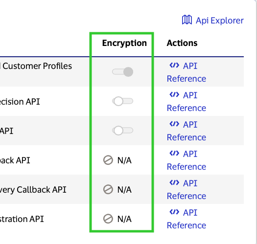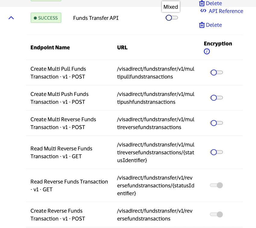 Some VDP APIs have endpoints with varying MLE controls. By clicking the down arrow to the left of the API Name, you can expand to see the state of MLE for each endpoint of that API.