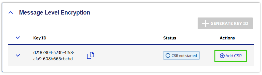 Key-ID is a system generated unique identifier (UID), which is associated with your project and identifies the associated key-pairs. This Key-ID must be included as a request header in API calls. Key-ID can be generated and is accessible under the Message Level Encryption section for applicable projects. At any given time, client can have up to 3 pairs of Key-IDs active per project. This helps allow for more seamless migration to new MLE certificates.