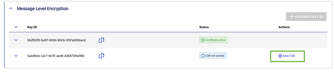 2. Upload CSR for the generated Key-ID by clicking on Add CSR.