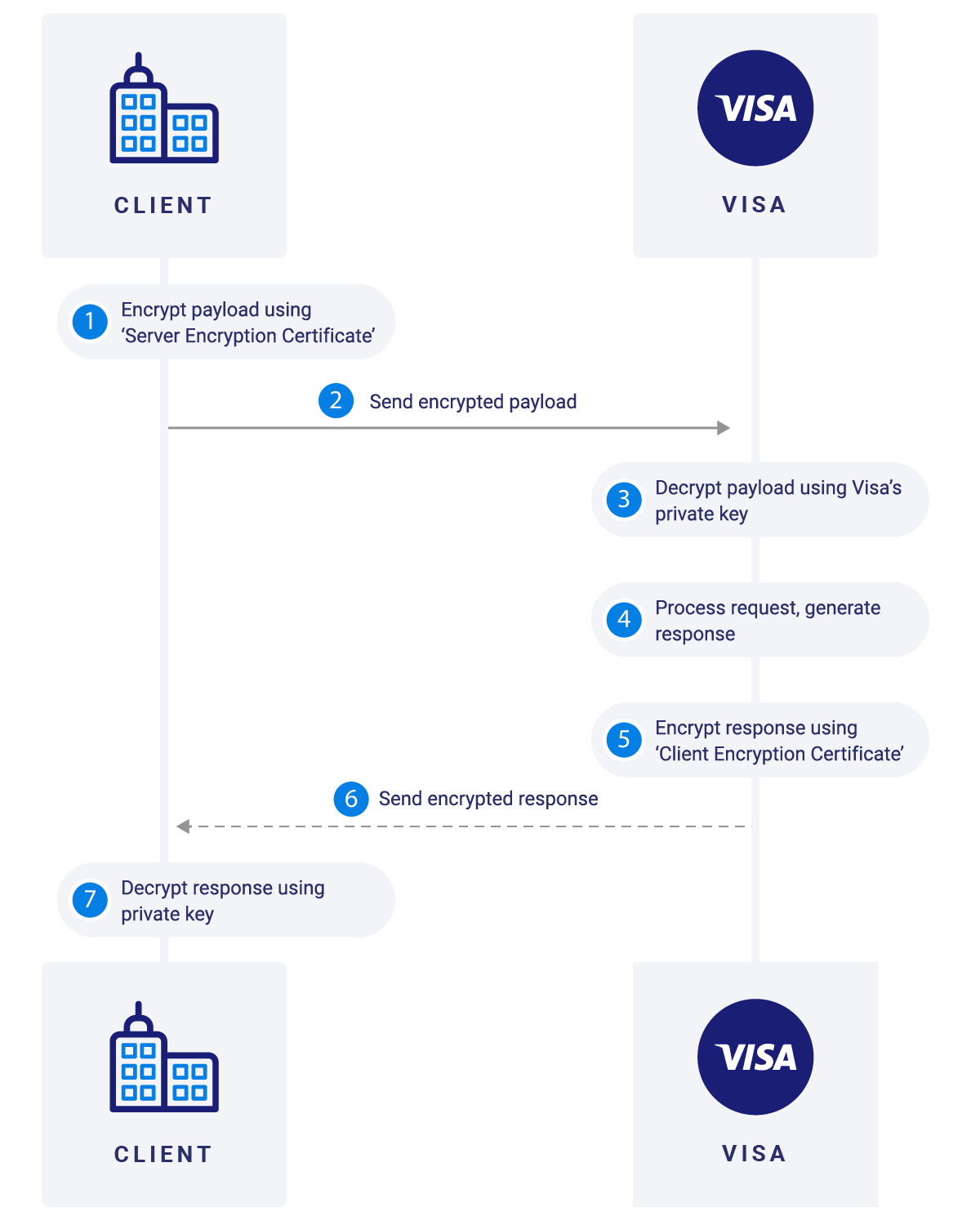 Client uploads the CSR for the relevant Key-ID. Public key for this certificate is stored on Visa servers; public key is available for verification under the Message Level Encryption section of applicable projects. Visa will encrypt the response (message payload) using the public key (of client); client will use the applicable private key stored on their environment to decrypt the payload and process the API response.