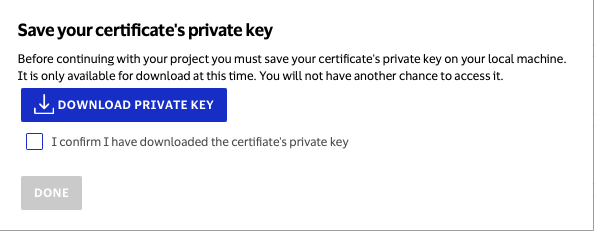 Download the private key to your local machine. Once you have made sure it is saved to your computer, please confirm and click done.