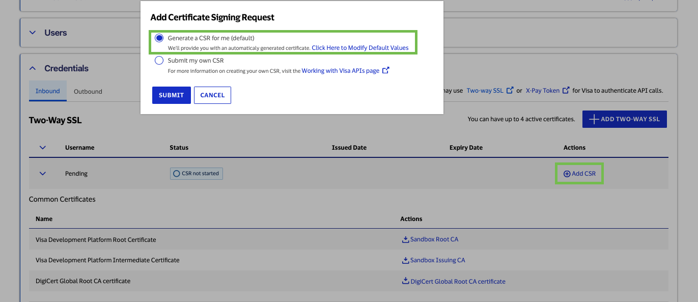 In the Sandbox environment, there are two methods for Adding a Certificate Signing Request to a project. By selecting “Generate a CSR for me (default),” Visa Developer will provide you with an automatically generated certificate based on default values. You can also choose to create and upload your own CSR by selecting “Submit my own CSR.”
