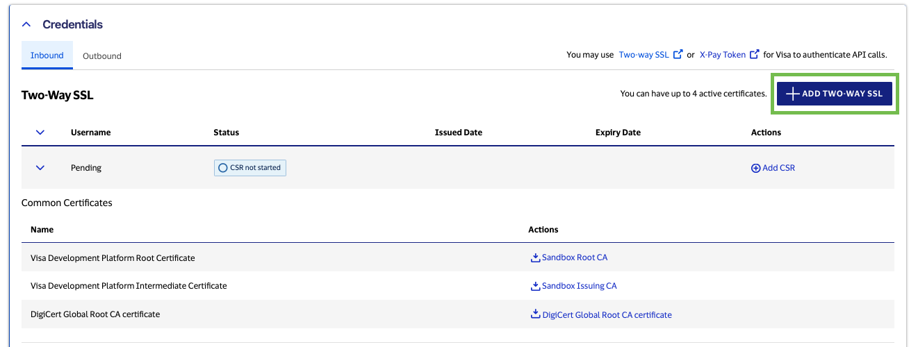 In order to configure Two-Way SSL, you must create the Certificate Signing Request (CSR) and use Visa Developer to obtain the VDP root CA and project specific certificate. The certificates and the private key need to be bundled together into a keystore (either Java Key Store or PKCS12 keystore), as described in the Configuring 2-way SSL Keystore section.